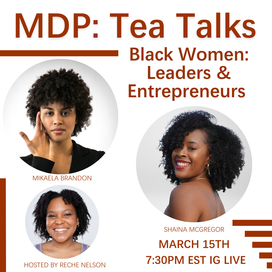 McKoy Dance Project celebrated Women’s History Month through MDP | Tea Talks: Black Women Leader & Entrepreneurs. In this Tea Talk, hosted by MDP’s Former Marketing Associate Reché Nelson, we amplified the voices of two women very close to the MDP community, Mikaela Brandon and Shaina McGregor. They shared an engaging conversation about black hair, the intersectionality of being both black and a woman in the dance world, and how they are balancing hats of being both performing artists and entrepreneurs.